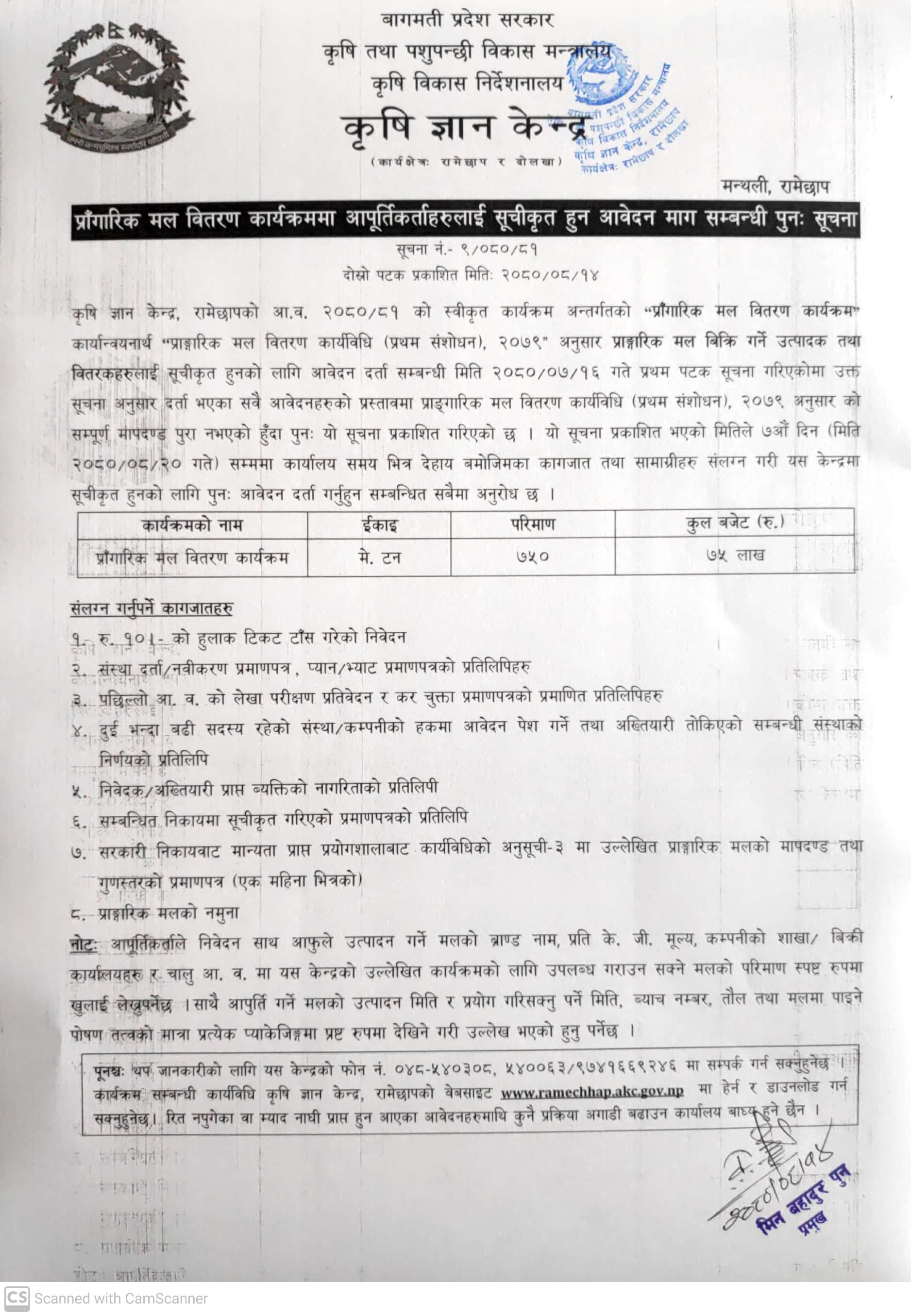 प्राङ्‍गारिक मल वितरण कार्यक्रममा आपूर्तिकर्ताहरु सूचीकृत हुने बारेको पुन सूचना 2080-08-14 Closed !!!