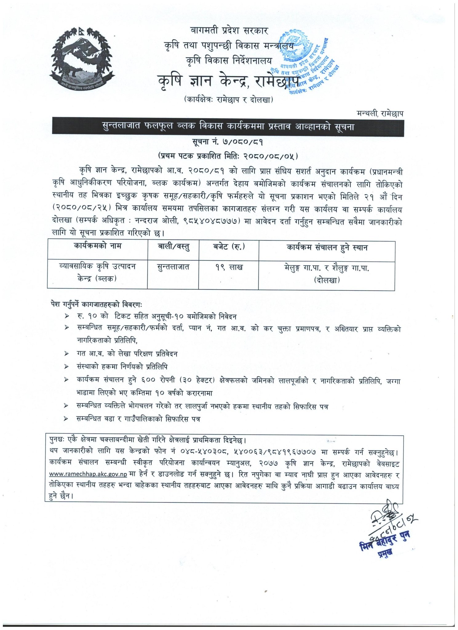 सुन्तलाजात फलफूल ब्लक विकास कार्यक्रममा प्रस्ताव आव्हानको सूचना 2080-08-05 Closed !!!