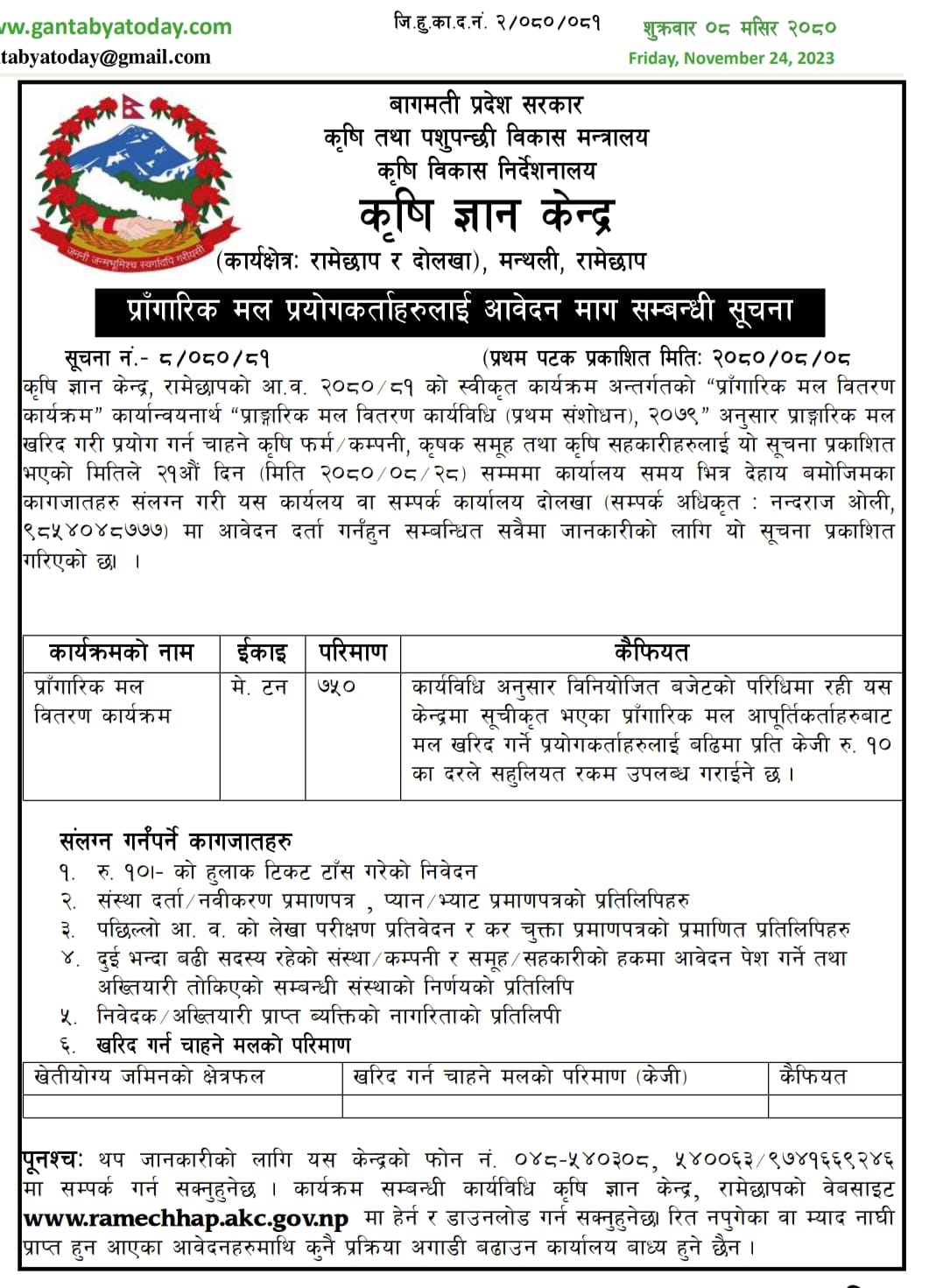 प्राँगारिक मल प्रयोगकर्ताहरुलाइ आवेदन माग सम्बन्धी सूचना 2080-08-08 Closed !!!