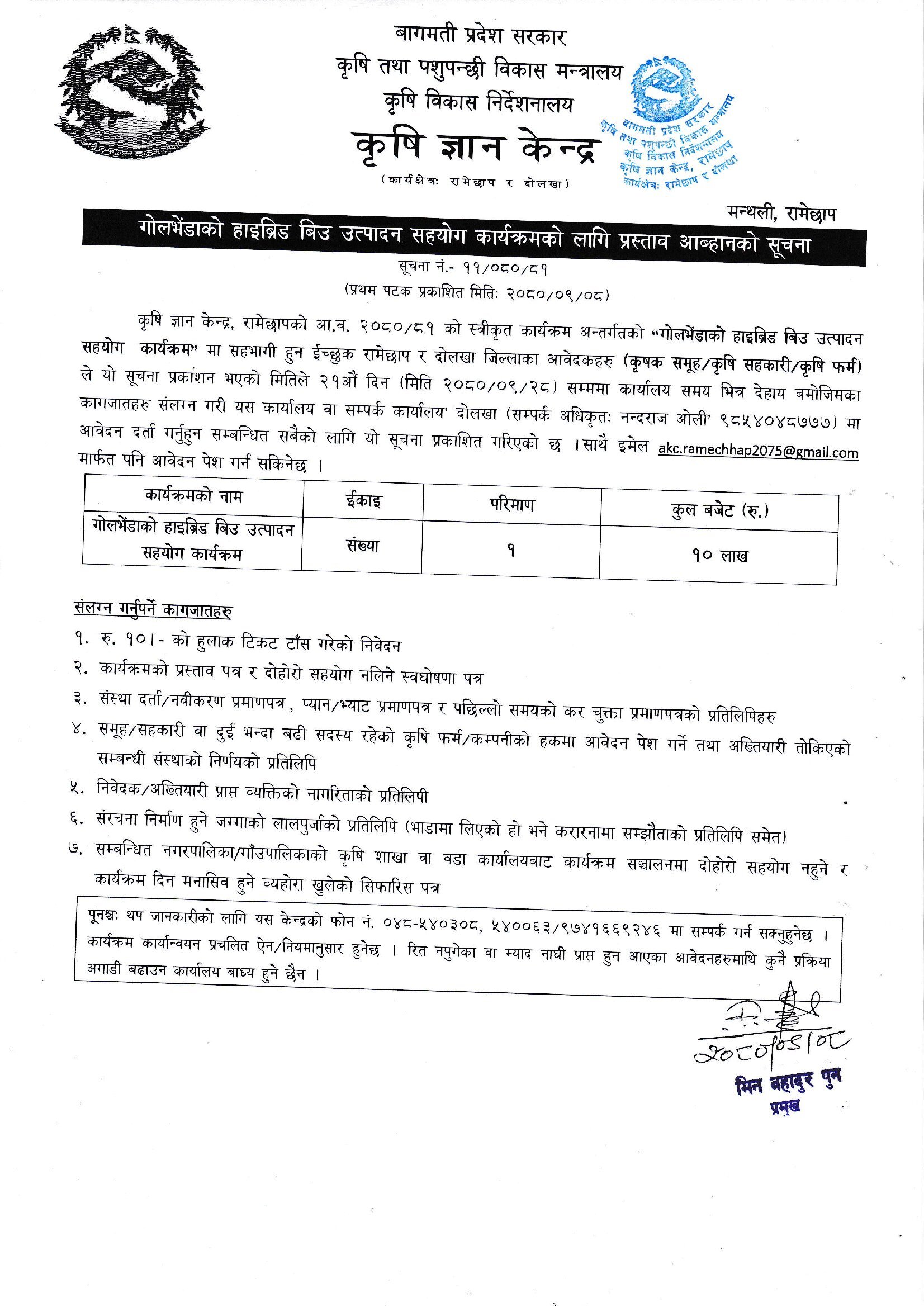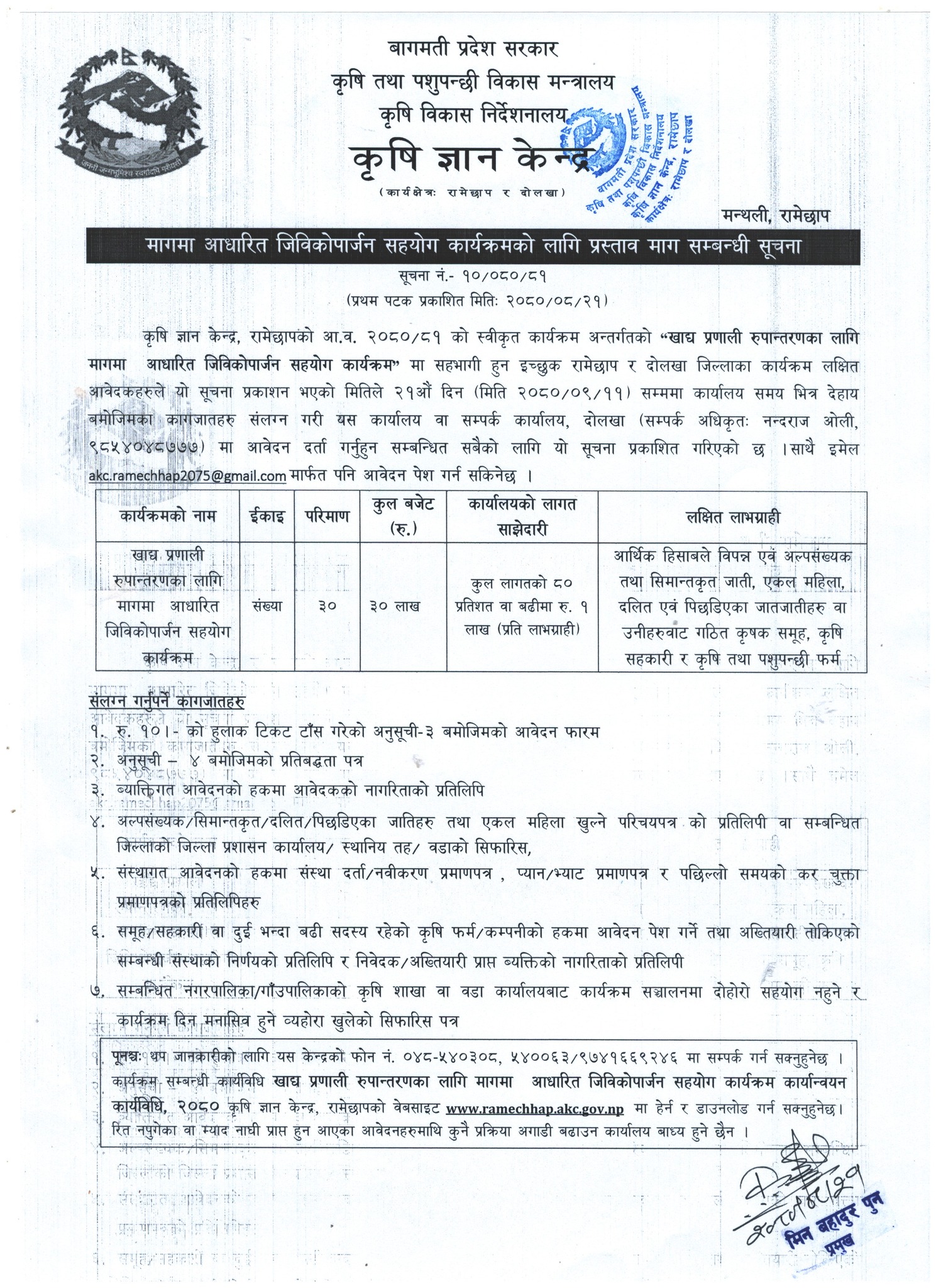 कृषि विकासका लागि बिउँपूजी कोष परिचालन कार्यक्रमको लागि प्रस्ताव आब्हानको सूचना 2080-10-09 Closed !!!