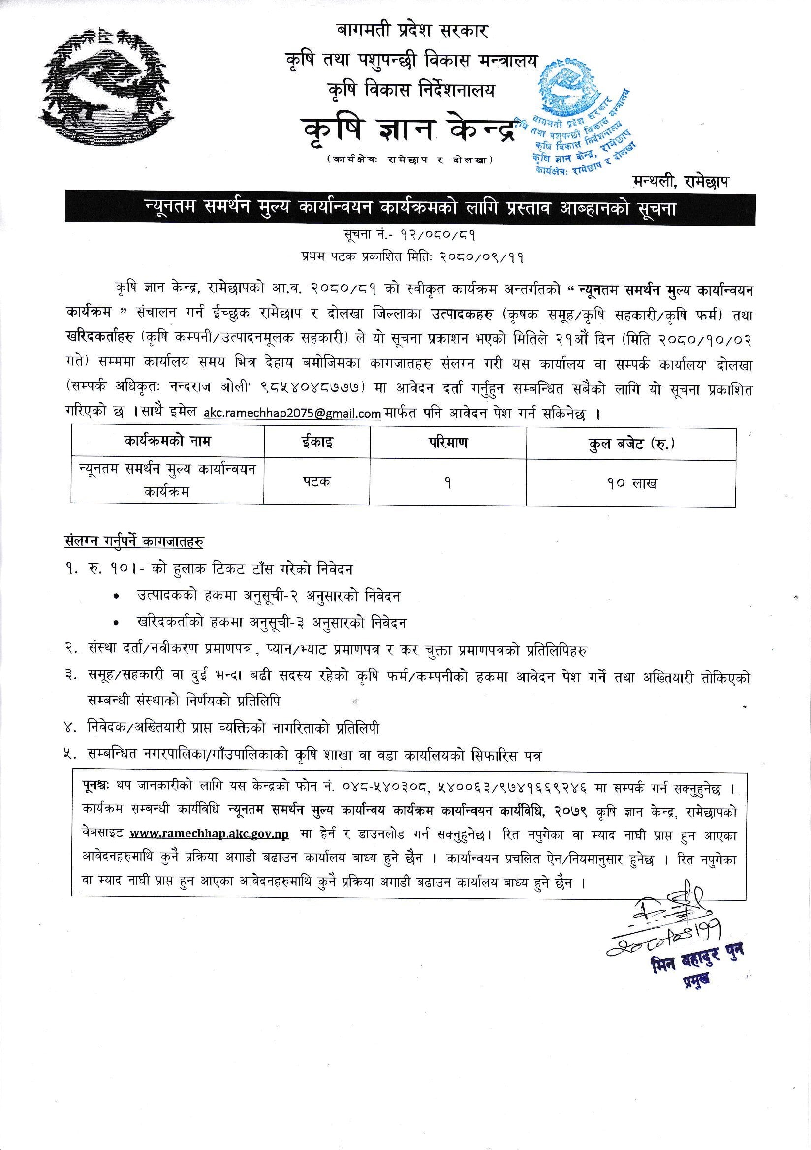 न्यूनतम समर्थन मुल्य कार्यान्वयन कार्यक्रमको लागि प्रस्ताव आब्हानको सूचना 2080-09-11 Closed !!!