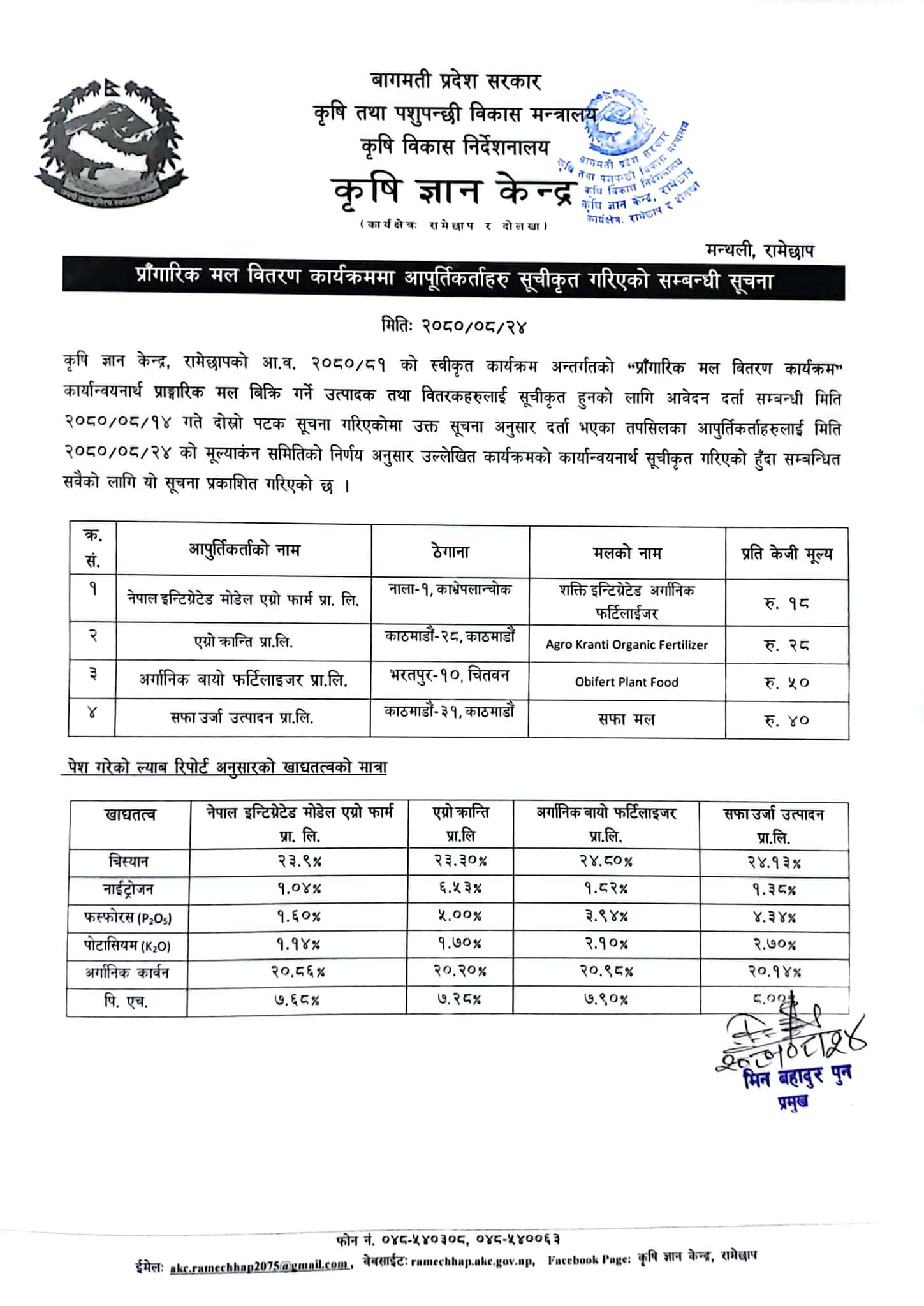 प्रांगारिक मल वितरण कार्यक्रममा आपूर्तिकर्ताहरु सुचिकृत गरिएको सूचना 2080-08-24 Continuous