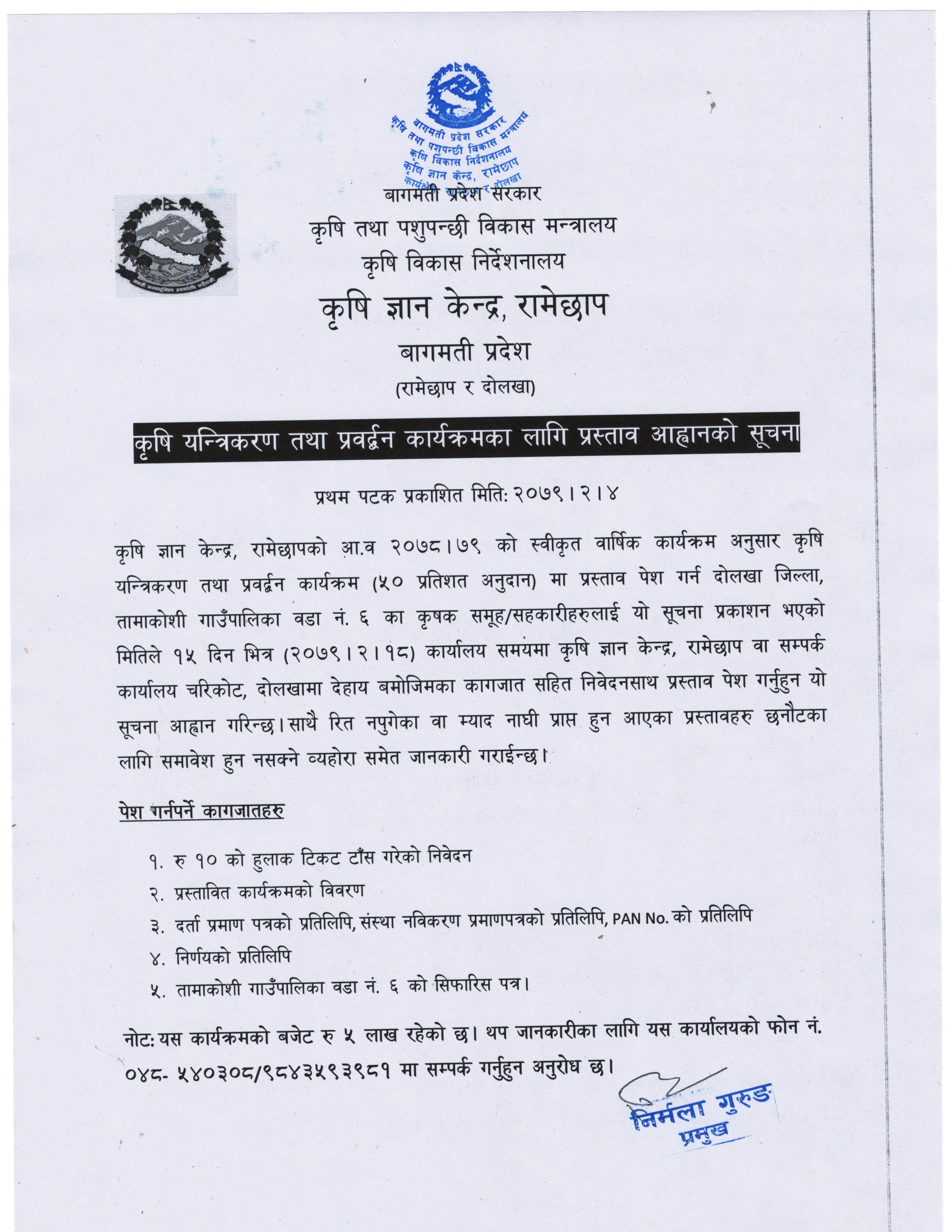 कृषि यन्त्रिकरण बोलपत्र आह्वान सूचना 2079-02-03 Closed !!!