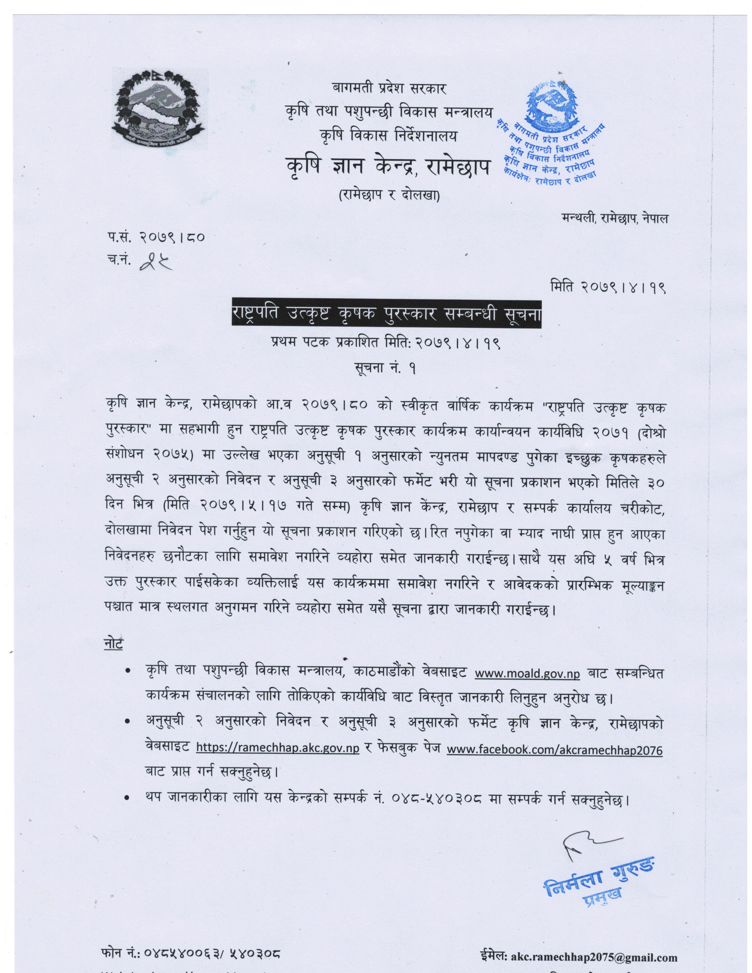 राष्ट्रपति उत्कृष्ट कृषक पुरस्कार 2079-04-19 Closed !!!