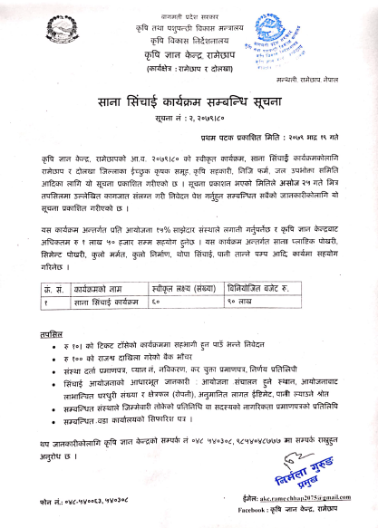 साना सिंचाई कार्यक्रम (कुलो निर्माण/मर्मत सम्भार, सिमेन्ट पोखरी, थोपा सिंचाई, प्लाष्टिक पोखरी, पम्पसेट खरिद आदि) सम्बन्धि सूचना 2079-05-19 Closed !!!