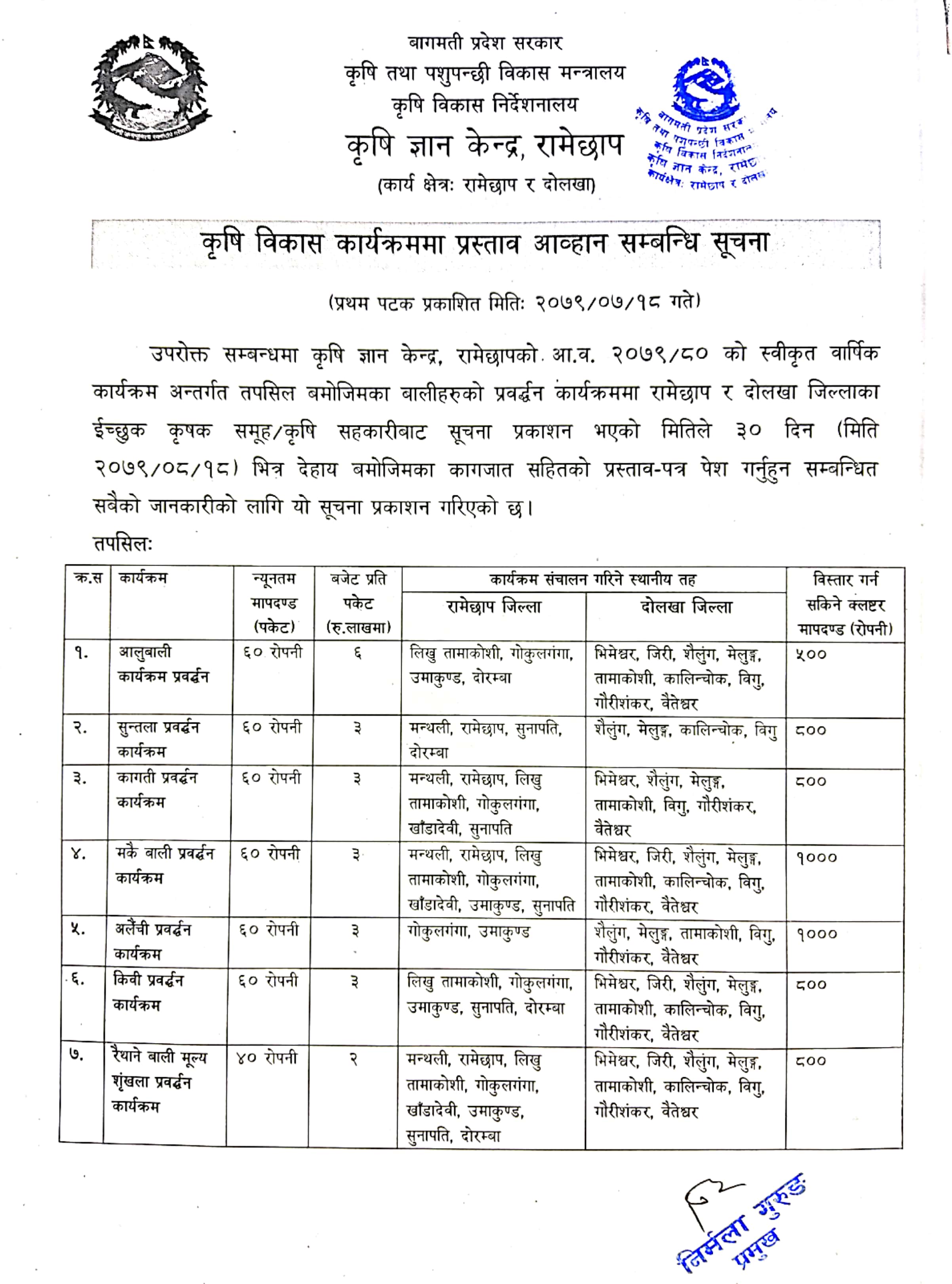 प्रवर्दन कार्यक्रम (आलु, किवी, मकै, अलैंची, कागती/सुन्तला, रैथाने) 2079-07-18 Closed !!!