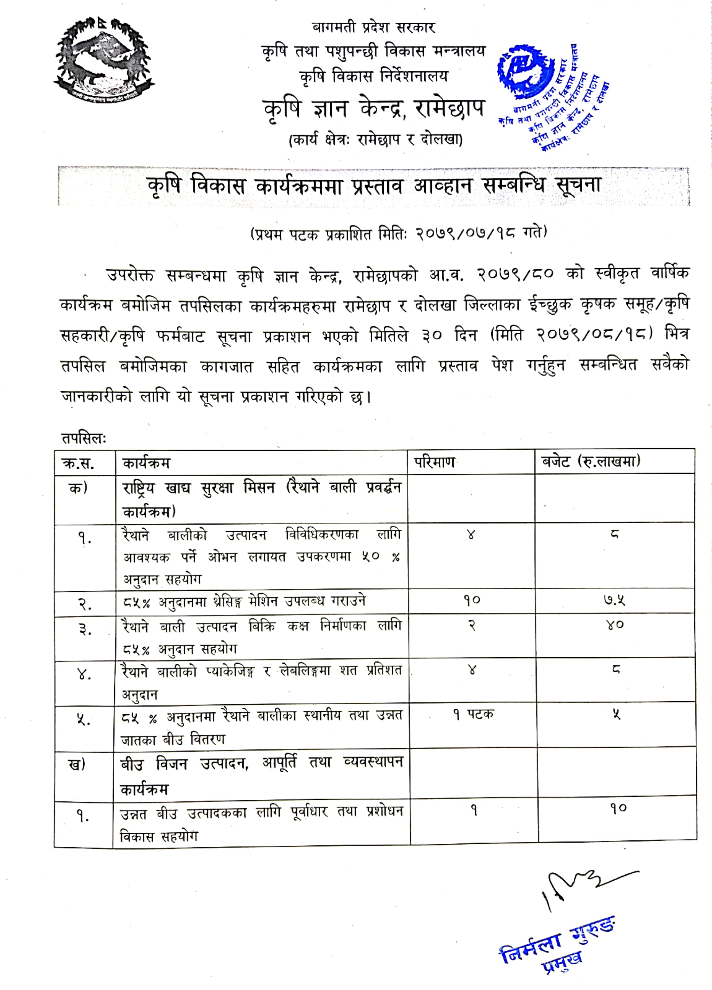 राष्ट्रिय खाद्य सुरक्षा मिसन तथा बीउ पूर्वाधार तथा प्रशोधन विकास सहयोग कार्यक्रम 2079-07-18 Closed !!!