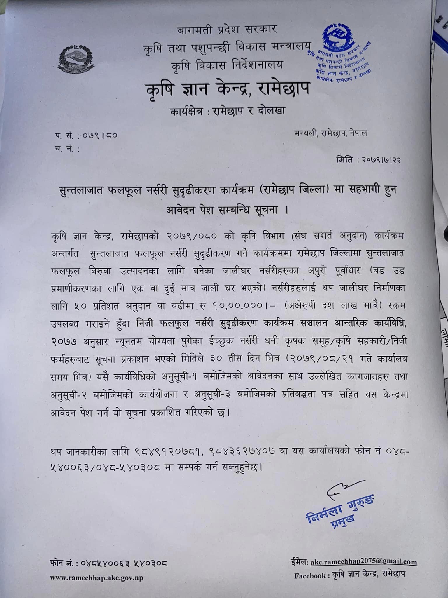 सुन्तलाजात फलफूल नर्सरी सुदृढीकरण कार्यक्रम (रामेछाप जिल्ला) मा सहभागी हुन आवेदन पेश सम्बन्धि सूचना । 2079-07-22 Closed !!!